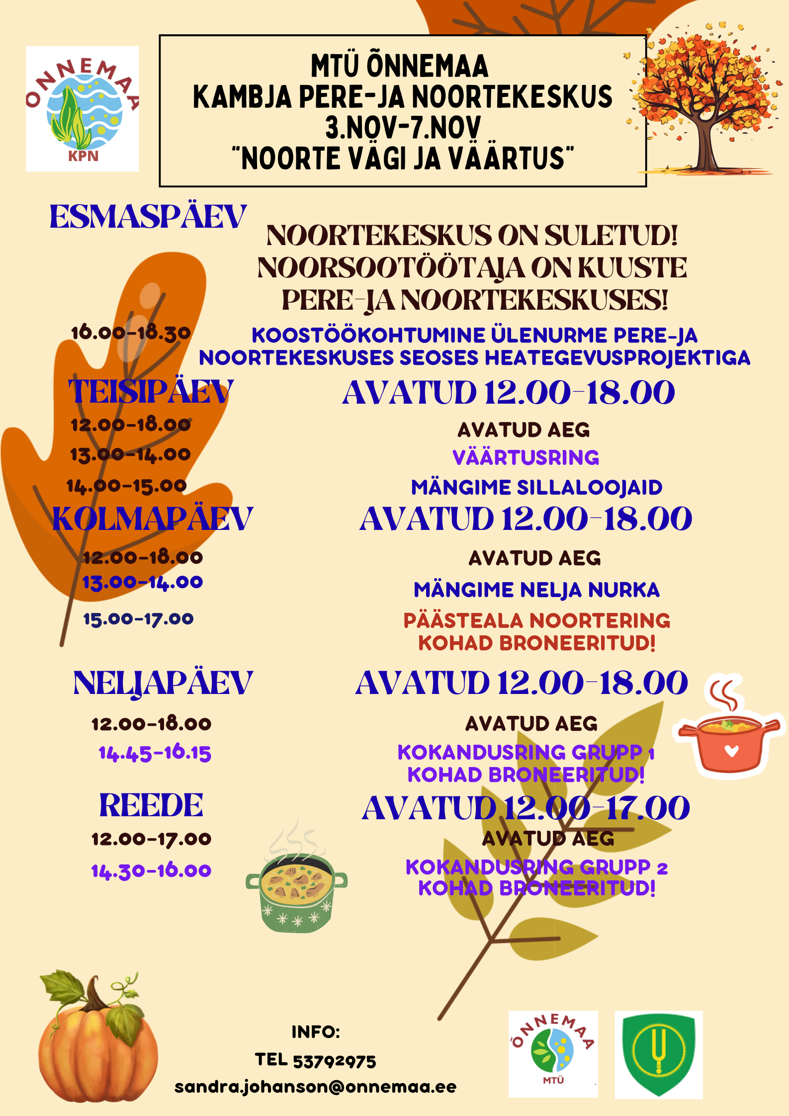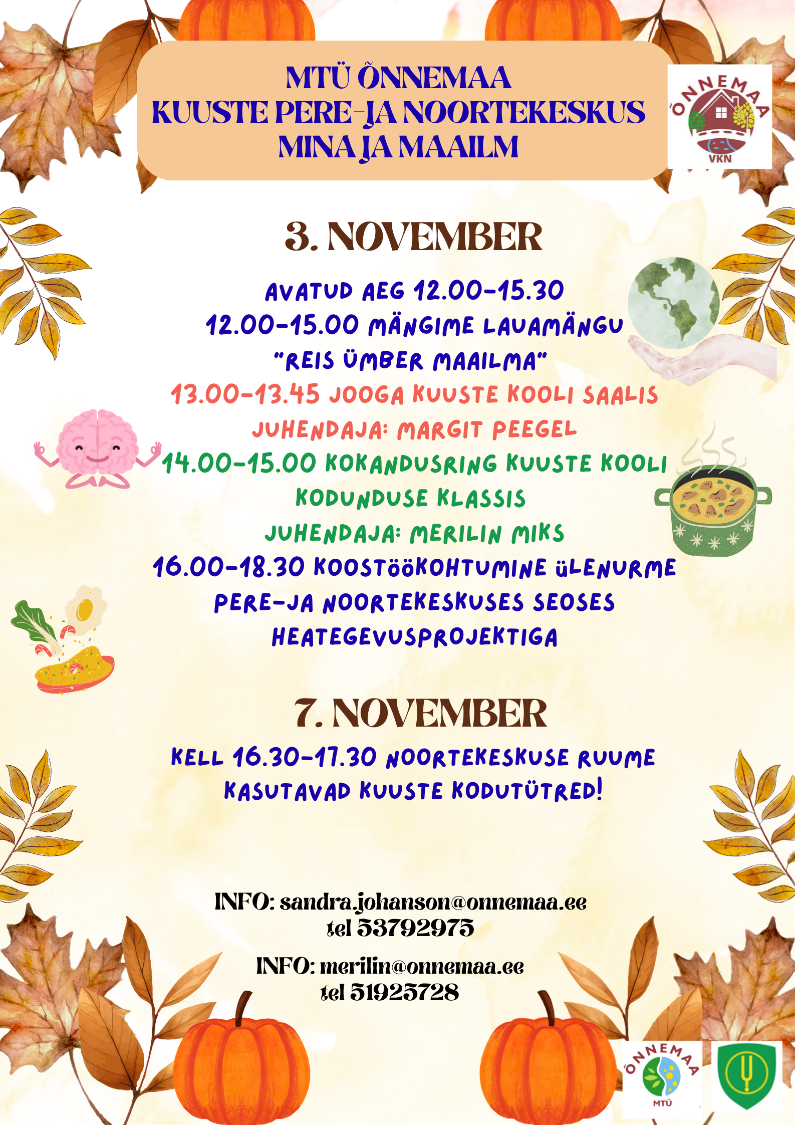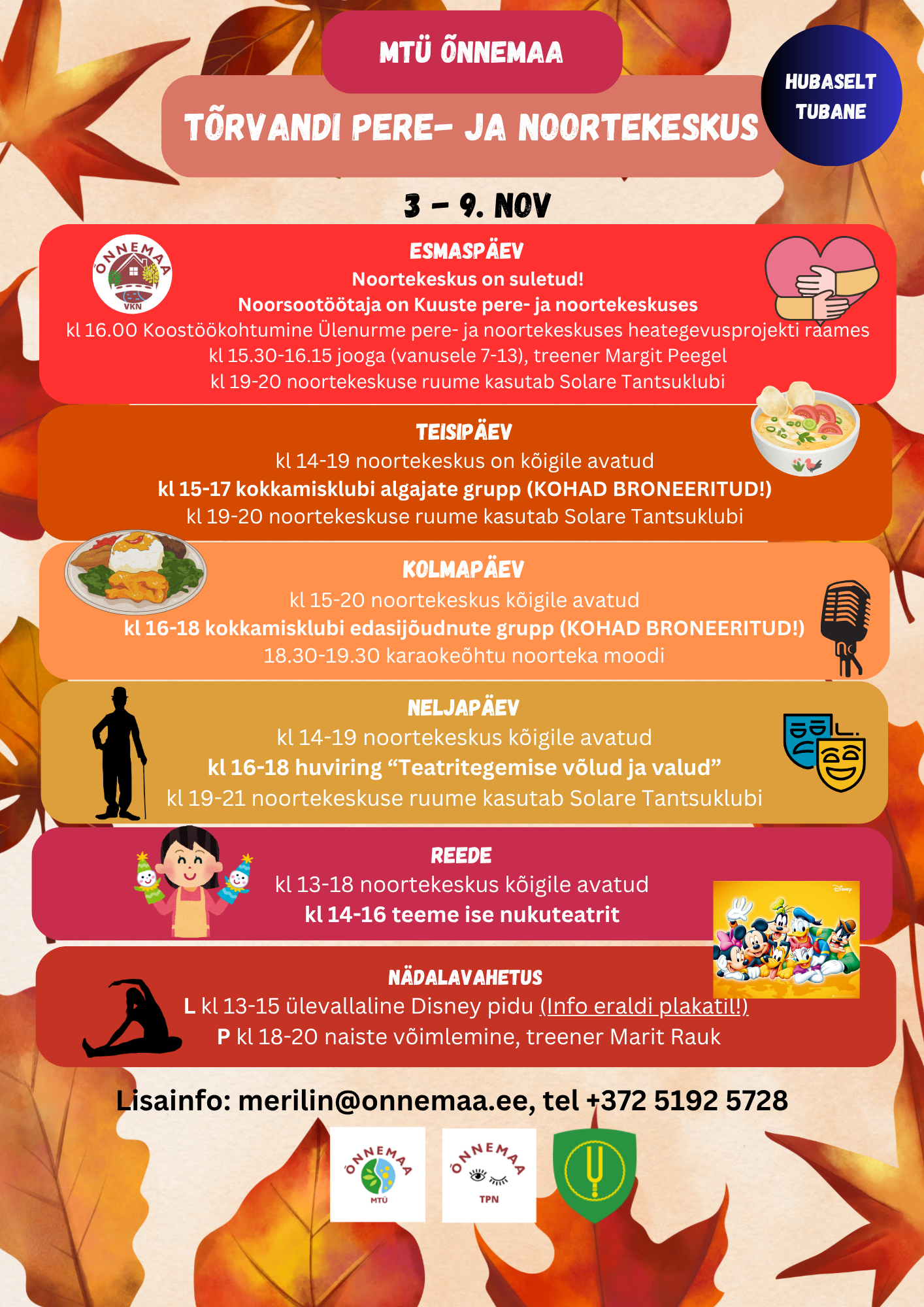 MTÜ Õnnemaa FollowFollowFollow MTÜ Õnnemaa 1 week 22 hours ago Registreerimislink: forms.gle/NsZjUf96Cfmnetzs8 Noortekeskused Ülenurme Ülenurme pere- ja noortekeskus 1 day 22 minutes ago Täna õppisime kokandusringis, kuidas teha klassikalist kartulisalatit👨🍳👨🍳👨🍳🥔🥕🥒 Ülenurme pere- ja noortekeskus 2 days 4 hours ago Registreerimislink: forms.gle/NsZjUf96Cfmnetzs8 Tõrvandi Tõrvandi pere- ja noortekeskus 1 day 20 minutes ago Täna tegime algajate kokkamisklubis makaronisalatit. 🤗 Salat valmis päris kiiresti ja oli väga maitsev. 😋 Noored jäid väga rahule! 🥳🎉 Tõrvandi pere- ja noortekeskus 2 days 20 minutes ago Tänase viimase joogatunni teema oli jooga libistades, rullides, kiikudes ja mängides. 😇🧘♀️ Kohtume taas juba uuel aastal! 🙂 Kambja Kambja pere- ja noortekeskus 5 days 1 hour ago Tänases kokandusringis tegime noortega apelsinimaitselisi pulgakooke! 🧡🍊🧁🍥Vahvat Halloweeni! 🎃👻 Kambja pere- ja noortekeskus 5 days 4 hours ago Kuuste Kuuste pere- ja noortekeskus 1 day 21 hours ago Tänase viimase joogatunni teema oli jooga rõõmud liikudes ja tantsides ning muinasjutujooga asendid. 😇🧘♀️💃🕺 Kohtume taas juba uuel aastal! 🙂 Kuuste pere- ja noortekeskus 2 days 1 hour ago Täna tegime kokandusringis nelja juustu pastat salatiga. 🧀 Tegemine läks kiirelt ja lihtsalt. Kohtume taas juba järgmisel nädalal! 👋💪